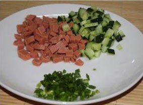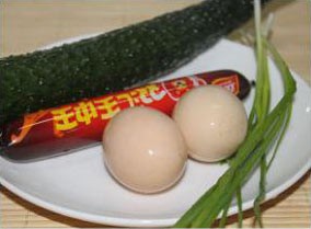准备好青瓜,火腿肠,鸡蛋葱蒜
