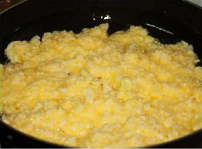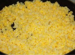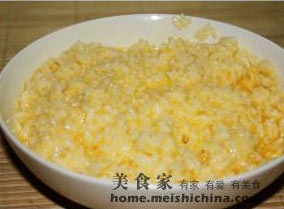 锅内放适量油,热后,转中火,将浸泡过蛋液的米饭倒入。
