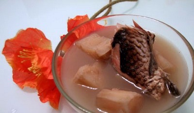 【功效】这道菜不仅味道鲜美,而且清热生津。木棉花、灯芯花、白鲫鱼、冬瓜,都有清热利水、消肿解毒、生津除烦等功效,非常适合体质湿热的人食用。