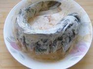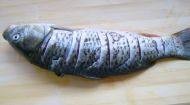 鲤鱼收拾干净后,沥干水,在鱼身两面个2.5厘米各斜切一刀(先立切1厘米深,再平切2厘米深)用胡椒粉、生抽和少许盐略腌