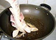 油烧至七成热,提起鱼尾,先将鱼头入油稍炸,再舀油淋在鱼身上,待面糊凝固时再把鱼慢慢放入油锅内。待鱼炸至金黄色,捞出控油放入盘中待用