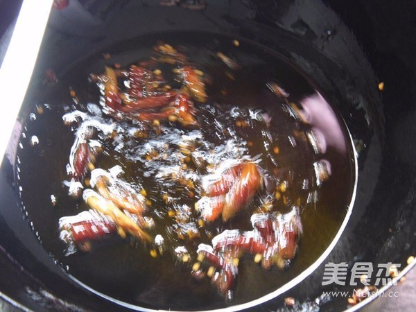 锅中放菜油(多些)油温高后关火迅速下人干辣椒和花椒,泼在鱼片上