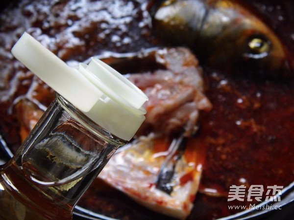 加料酒煮至颜色发白,调入盐、白糖和胡椒粉,边烧鱼边晃动锅,待鱼快熟时,调入酱油、香醋