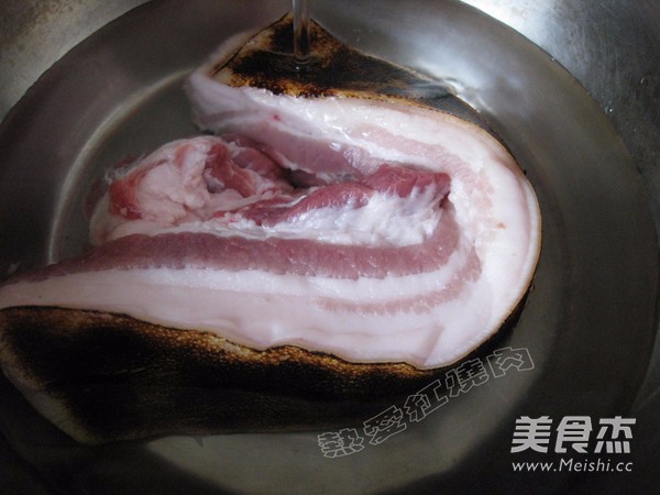 首先用喷枪给肉皮烧黑