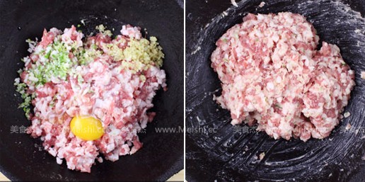 五花肉去皮,先切片再切丝然后切粒,然后放葱姜末、盐3克、少许黄酒、鸡蛋和少许水淀粉拌匀;顺着一个方向多搅拌一会儿,使其上劲,不容易破裂
