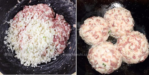 搅匀后把马路末倒进去接着一个方向搅拌一会儿,有粘性就可以了,抓一把肉馅团成大丸子,在手里左右倒几十个次,表面有粘性就可以了,可以做四个大丸子;搅匀后把马路末倒进去接着一个方向搅拌一会儿,有粘性就可以了,抓一把肉馅团成大丸子,在手里左右倒几十个次,表面有粘性就可以了,可以做四个大丸子