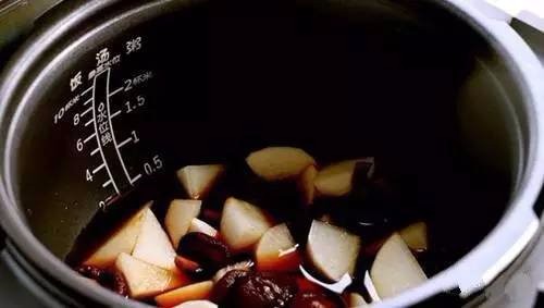 把白萝卜块儿和泡好的香菇连同泡香菇的水一同倒进电饭煲内胆,也可以用普通的煮锅。(注意:泡香菇的水不要丢弃,它含有很多营养物质,也有香菇的香气。)