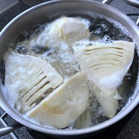 春笋剥壳切掉老根,对半切开,凉水入锅,水开后煮约15分钟。