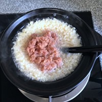 中火再次煮开后加入肉末,并用筷子稍微拨散,煮开后。转小火。