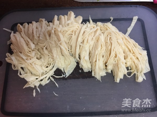 3、用温水把干豆皮泡软,用温水把干豆皮泡软 4、捞出沥干水分切成细丝