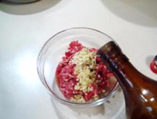 把姜切末后放入肉馅里,倒入少许黄酒、耗油、酱油。