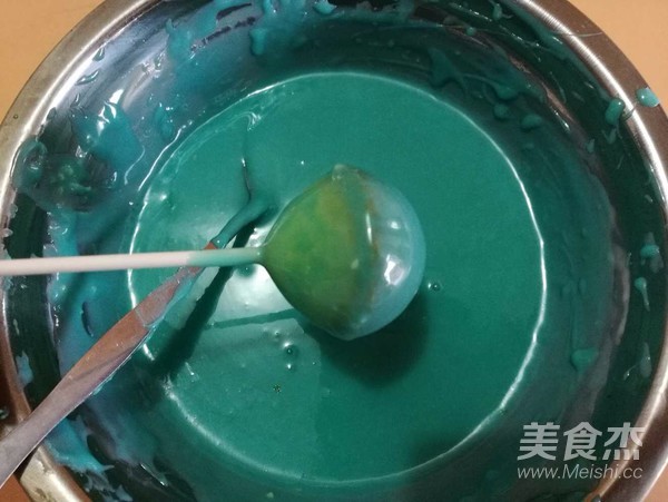 有银粉的白色巧克力放入裱花袋,挤在棒棒糖上面做装饰,最后放上糖珠,把银粉吹到棒棒糖上面。做装饰就可以了!