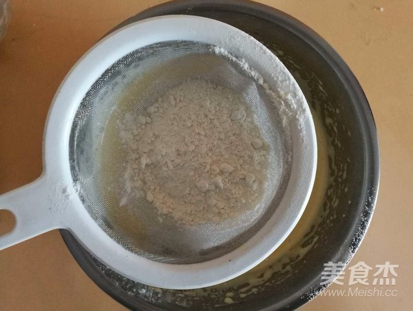分两次筛入低筋粉,刮刀轻轻翻拌