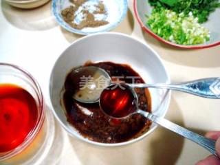 碗中放入1汤匙芝麻酱、1汤匙调味汁、0.5克鸡粉、0.5克花椒粉、1汤匙辣椒油和适量开水或鸡汤搅匀备用。