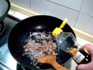 炒勺上火烧热,注入适量烹调油下入肉末煸炒,把肉末煸至干香,干燥至无任何水分为止,然后倒入少许香油炒匀。