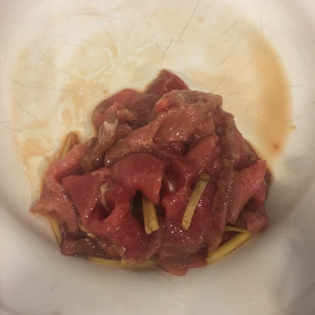 横切牛肉薄片用生抽、老抽、小苏打、糖、蚝油、姜丝、料酒、淀粉抓匀,再放一勺油抓匀腌制二十分钟。