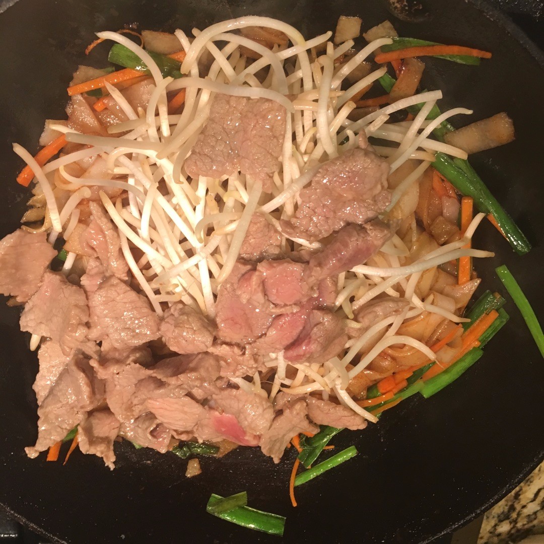 放入粉、牛肉和豆芽、放生抽、老抽、蚝油、盐和糖(以上四样调料最好提前倒入一个小碗做成调味汁,这样直接一次倒入会比较好)快速颠炒均匀。