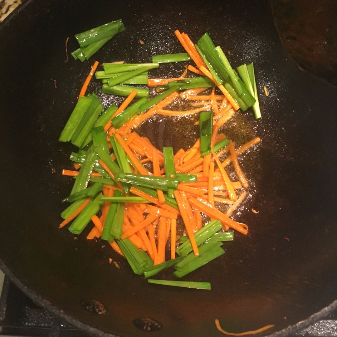 放入韭菜翻炒片刻,颠锅大火,避免粘锅。