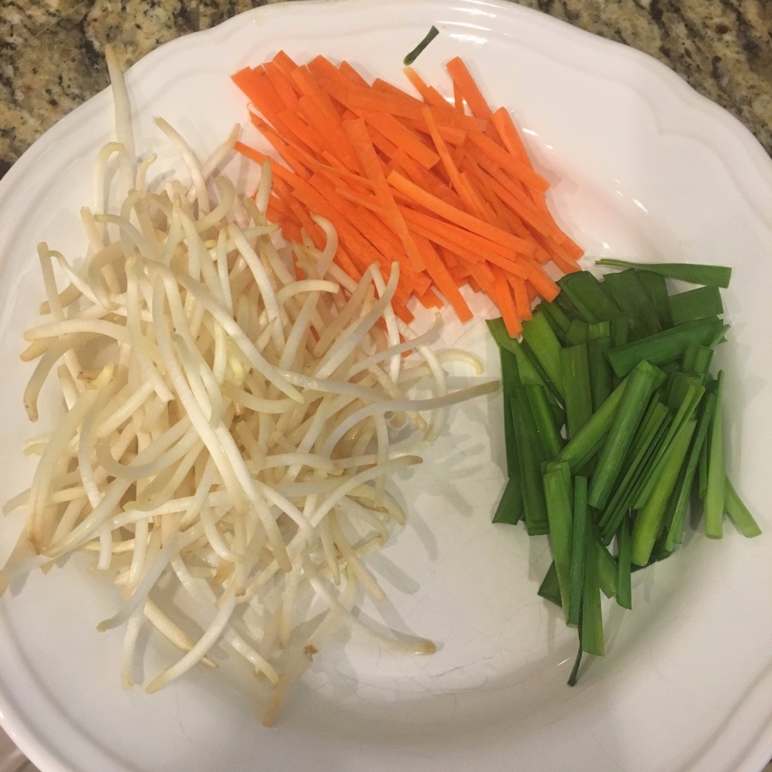 豆芽去头去尾,胡萝卜切细丝、韭菜切段。
