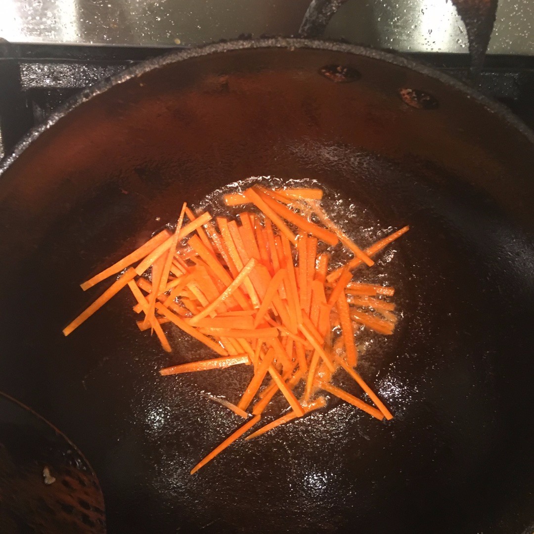 锅里热油,,放入胡萝卜丝炒至断生。