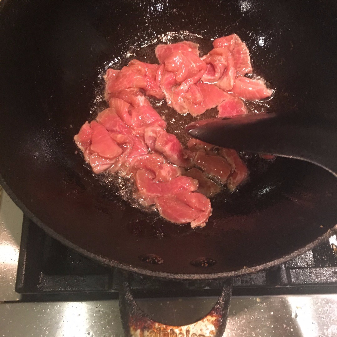 锅里热油,油量要多点,温油滑炒牛肉至六成熟捞出沥干油