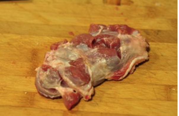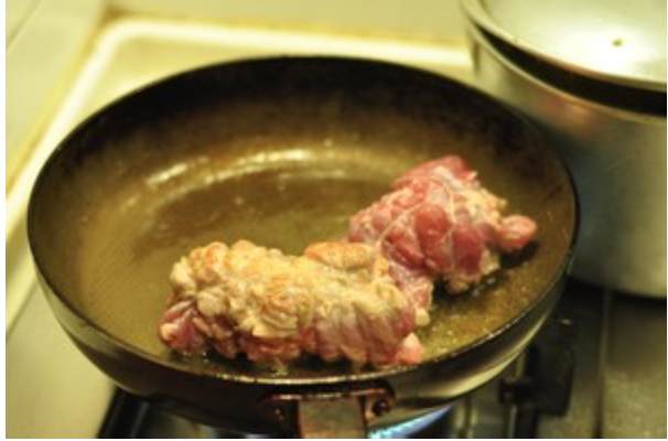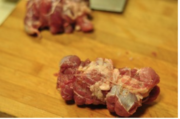 切过的猪肉展开,刀背拍松,卷起,棉线扎紧。
