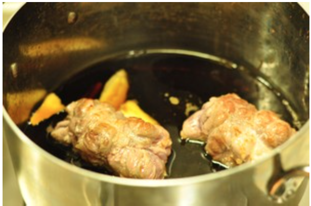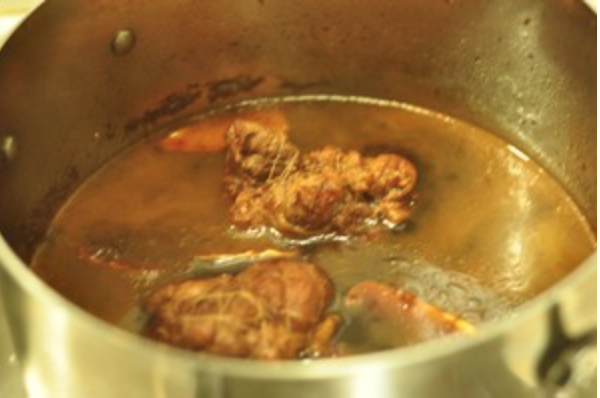 溏心蛋的卤汁里面加生姜,猪肉放入烧开后转小火一小时,如卤汁太少可适量加水。