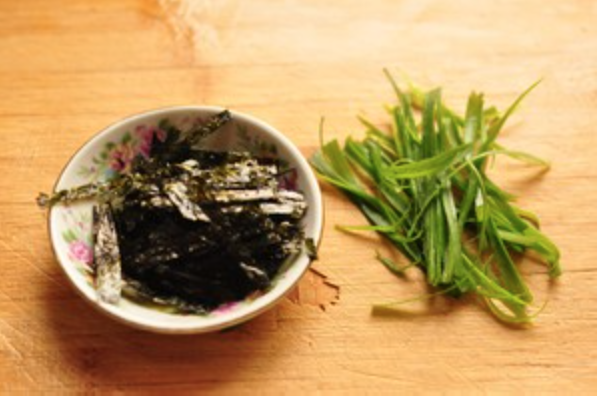 海苔剪碎,香葱切丝。