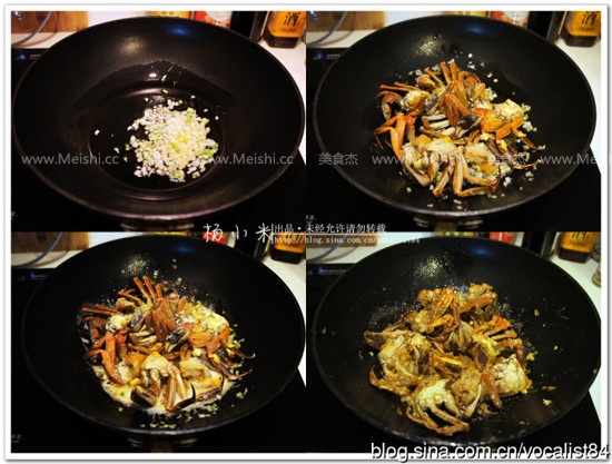 锅内倒入少许油炒香姜末和香葱末,倒入煎好的螃蟹翻炒数下