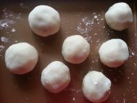 拿点手粉捏一下冰皮摊开包成汤圆形状【或使用一次性手套比较好做】