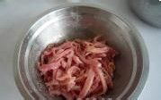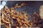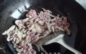 3、炒锅烧热放底油,下入腌制好的肉丝滑熟。盛出备用。