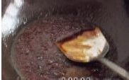 4、锅中放少许底油,倒入调好的甜面酱煸炒。