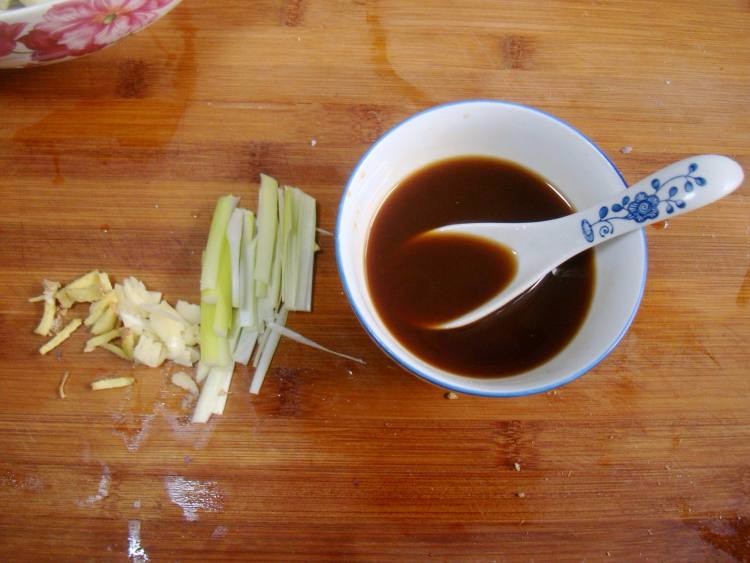 4.茄条浸泡的时候,葱姜切丝,蒜切末。准备料汁,小碗中放入1勺料酒、2勺酱油、三勺醋、四勺糖、5勺清水、一平勺淀粉,搅拌均匀。
