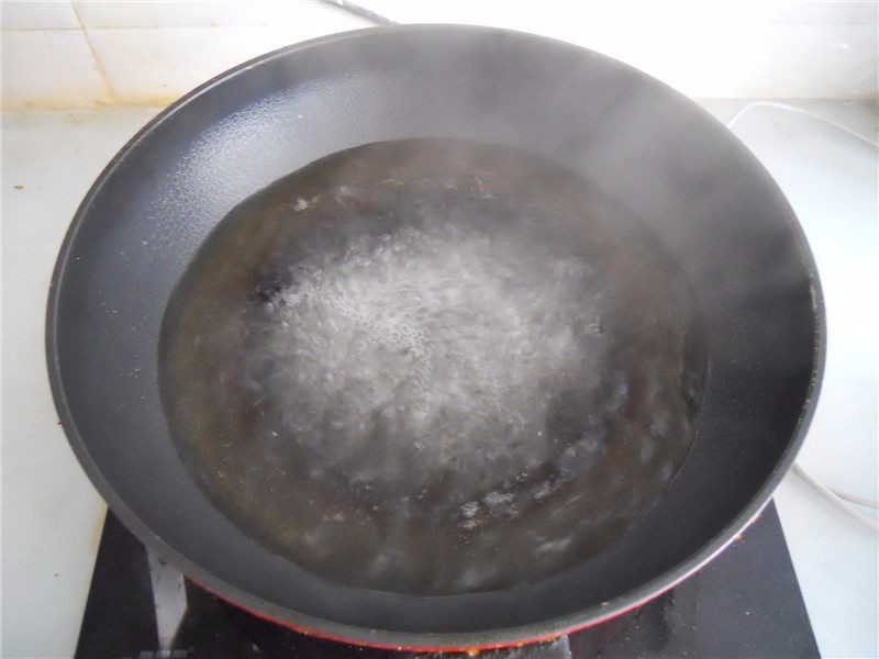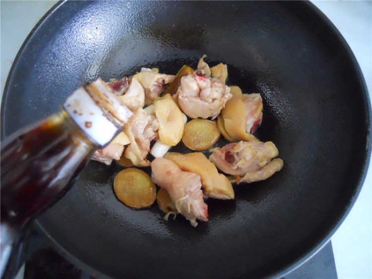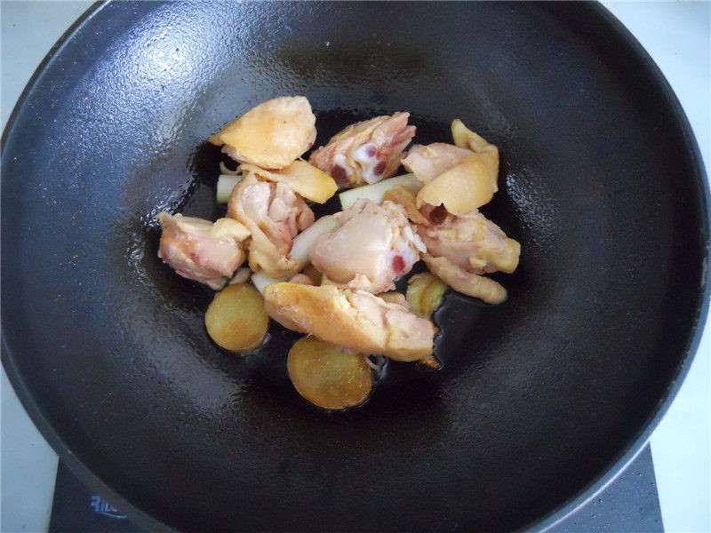 14.锅预热,放入豆油,不用太多,因为鸡肉就有鸡油,否则菜会太腻。