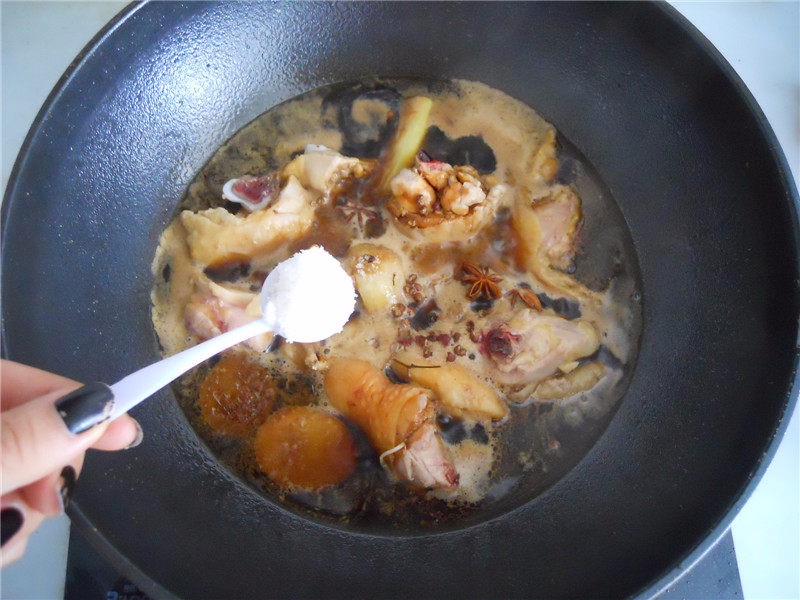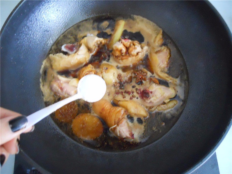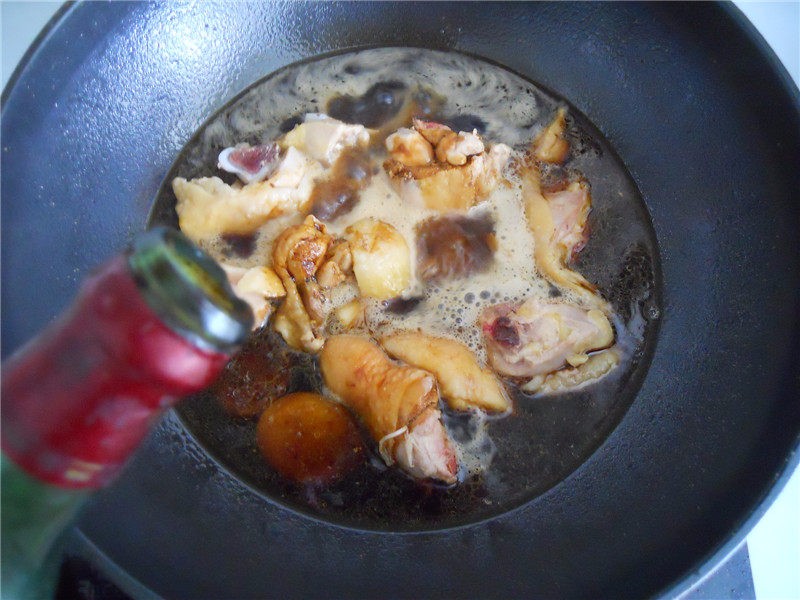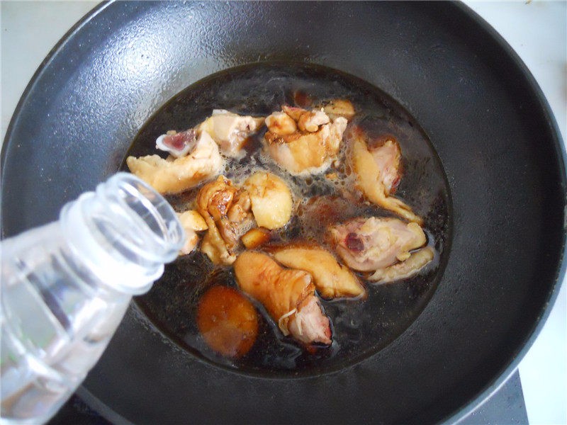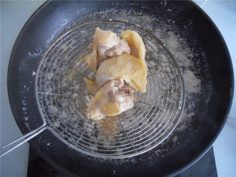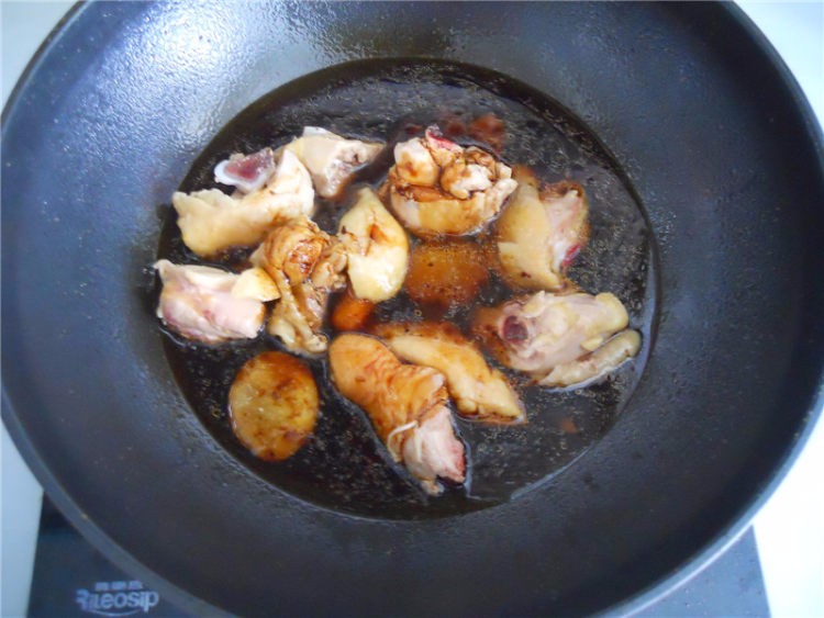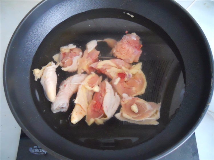 17.将鸡肉轻轻滑入锅中,将鸡肉被油煎一下。