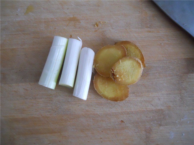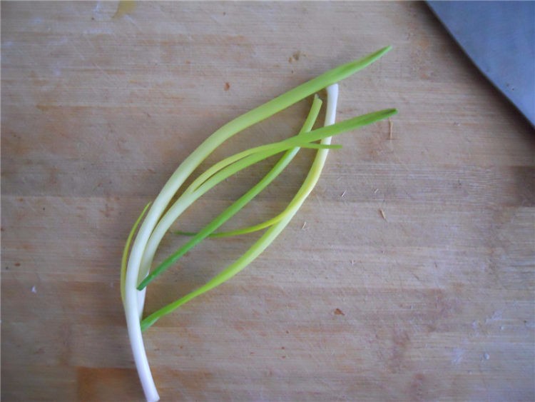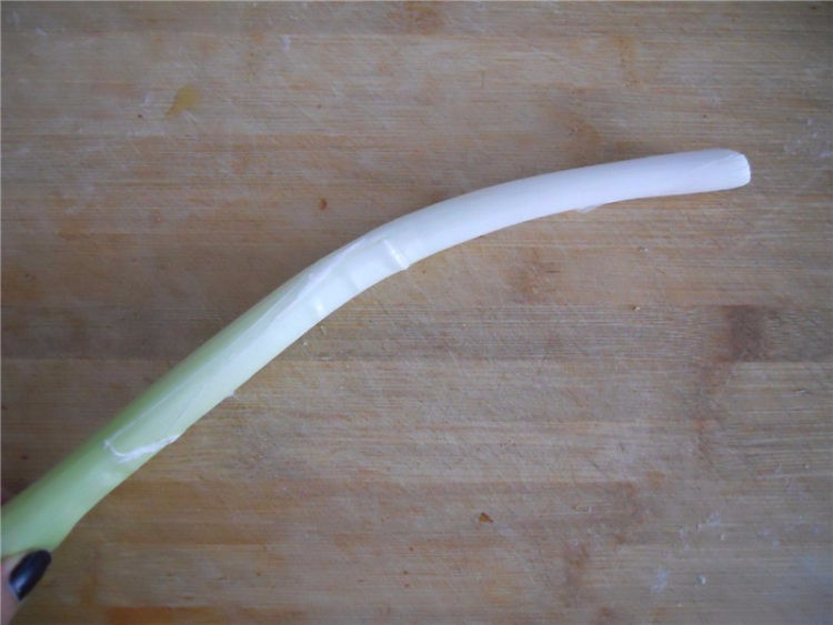 12.准备一根大葱,这根大葱是很粗的噢,不过这里显得小,炝锅和炖菜用大葱很香。
