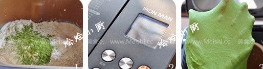 材料:高筋面粉332克、奶粉17克、抹茶粉5克、细砂糖40克、盐4克、酵母4克、牛奶140克、汤种110克