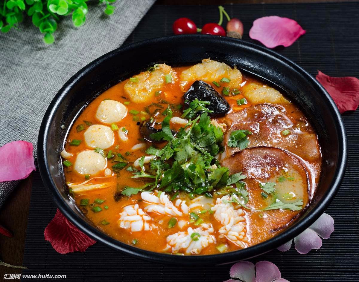把面汤、面和配料盛放在一起,加以白酱油等作料