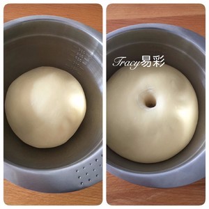 将除黄油外所有材料混合,进行揉面程序,揉至扩展阶段,加入黄油揉至黄油充分吸收并光滑