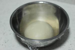 放入盆内盖上保鲜膜发酵至面团两倍大。(现在天气凉了建议使用烤箱发酵档位进行发酵,如果是烤箱没有发酵档位的可以使用蒸锅,在蒸锅内烧一锅稍有一点烫的热水后把装有面团的盆放在蒸架上盖上锅盖即可。)