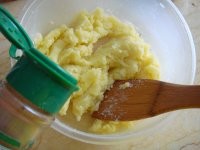 2. 加入土豆泥里,加入2克盐拌匀.加入胡椒粉.把土豆装进蛋挞模具里.盖上切成条的芝士.加上剪成条的紫菜.烤箱180度10分钟就可以了。