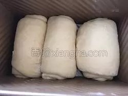 5.然后再次用擀面杖,擀长方形再卷起来,放在吐司上,然后放在烤箱发酵40分左右。