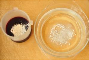 把分子料理两个原料,褐藻胶1.6g倒入蓝莓汁、钙质6.8倒入1000ml纯净水。