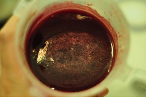 倾倒出果汁,蓝莓果粒可以继续做果酱或者棒冰。获取蓝莓汁的手段也可以用榨汁机原汁机,但是与柠檬汁煮过的蓝莓汁颜色更漂亮,紫红色,为了醒目,我用这种方法萃取果汁。