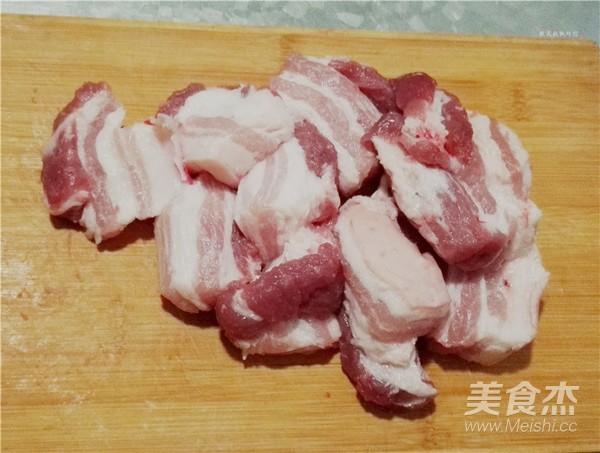 将五花肉清洗干净,浸泡出血水,然后切成薄厚均匀的长条形。