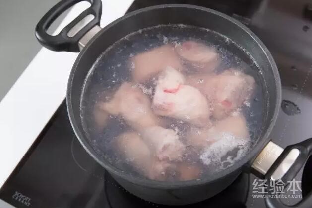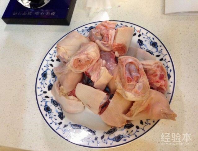 清水煮沸,加入猪蹄汆水去腥,再捞起备用