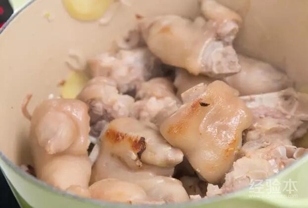 热锅入油,加入洋葱和姜片爆炒,再加入猪蹄炒至表面金黄