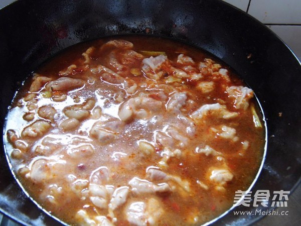 再加入腌制好的肉片划散,煮到肉片变白,煮的时间不要太长,以免肉片的口感太老