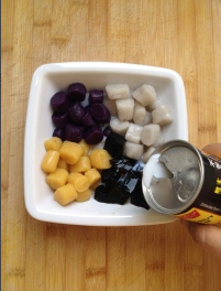 把龟苓膏切小块,和三种圆子码好,倒入椰奶即可;