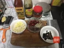 将蒜泥,姜片,料酒,蚝油,豆鼓,桂皮,干辣椒,豆瓣酱,香叶,八角,炒果备好。